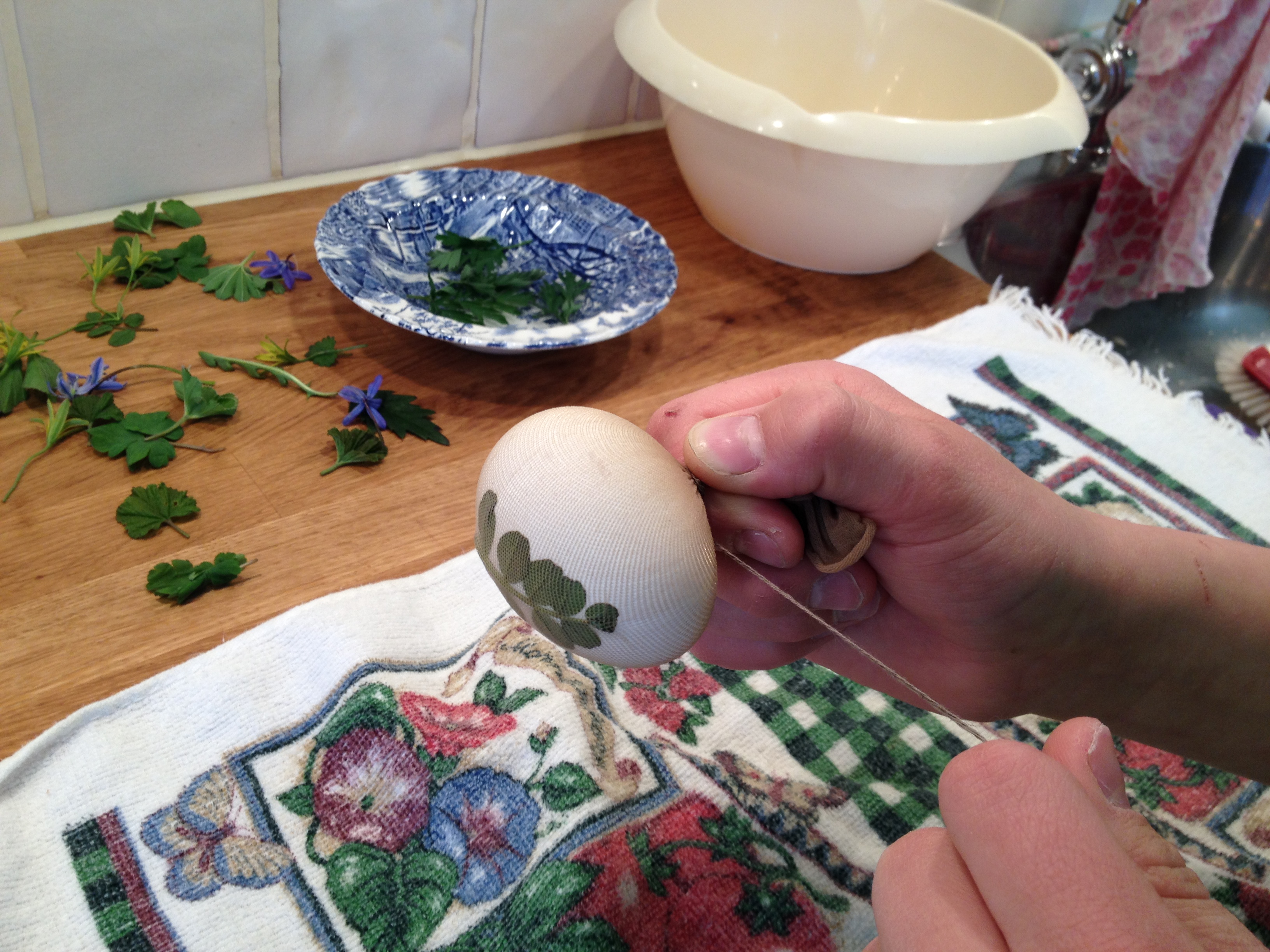 Legger planteblad på egget, legger strømpe over egget, strammer og binder med tråd for at den ikke åpnes under koking.