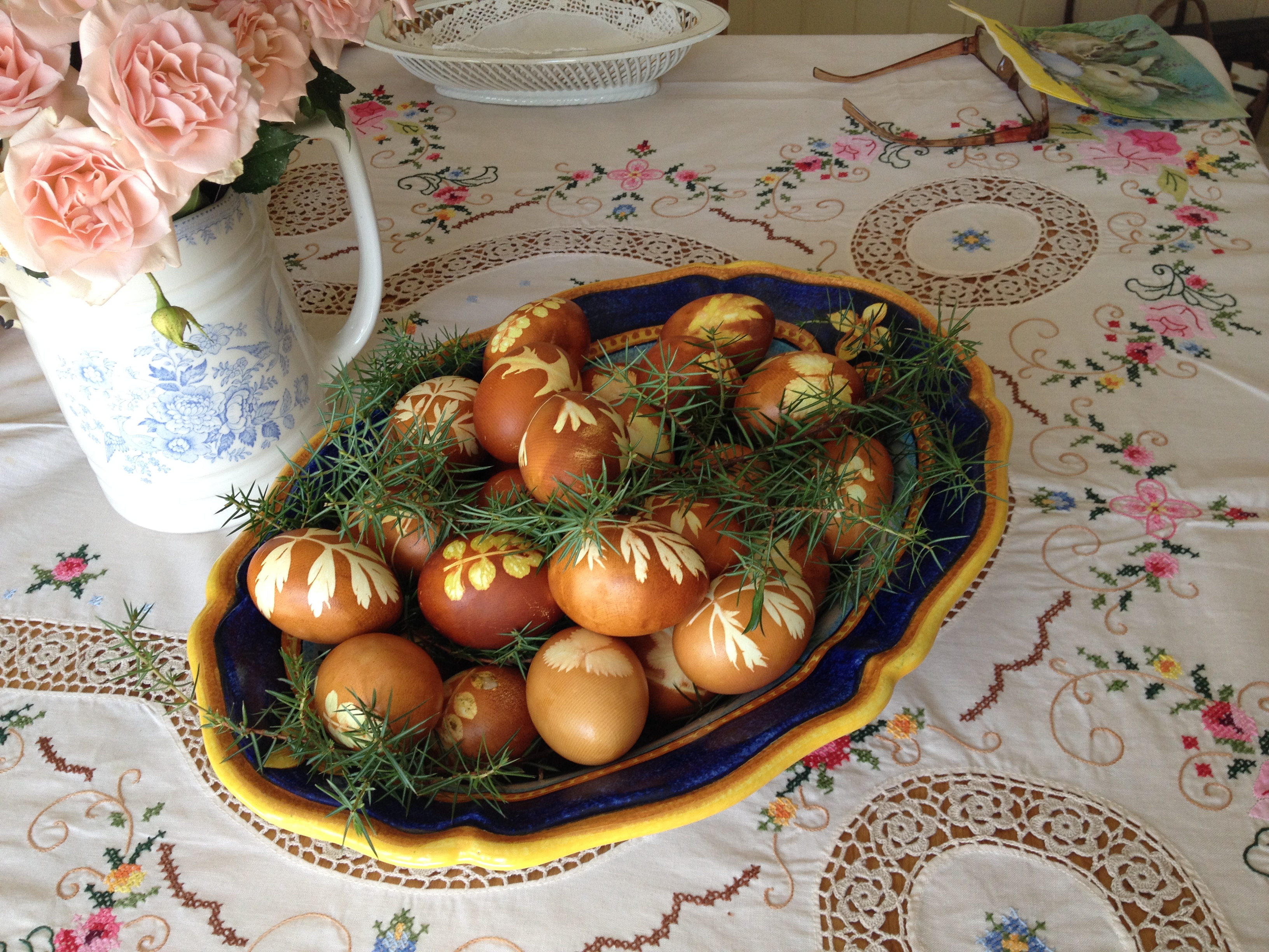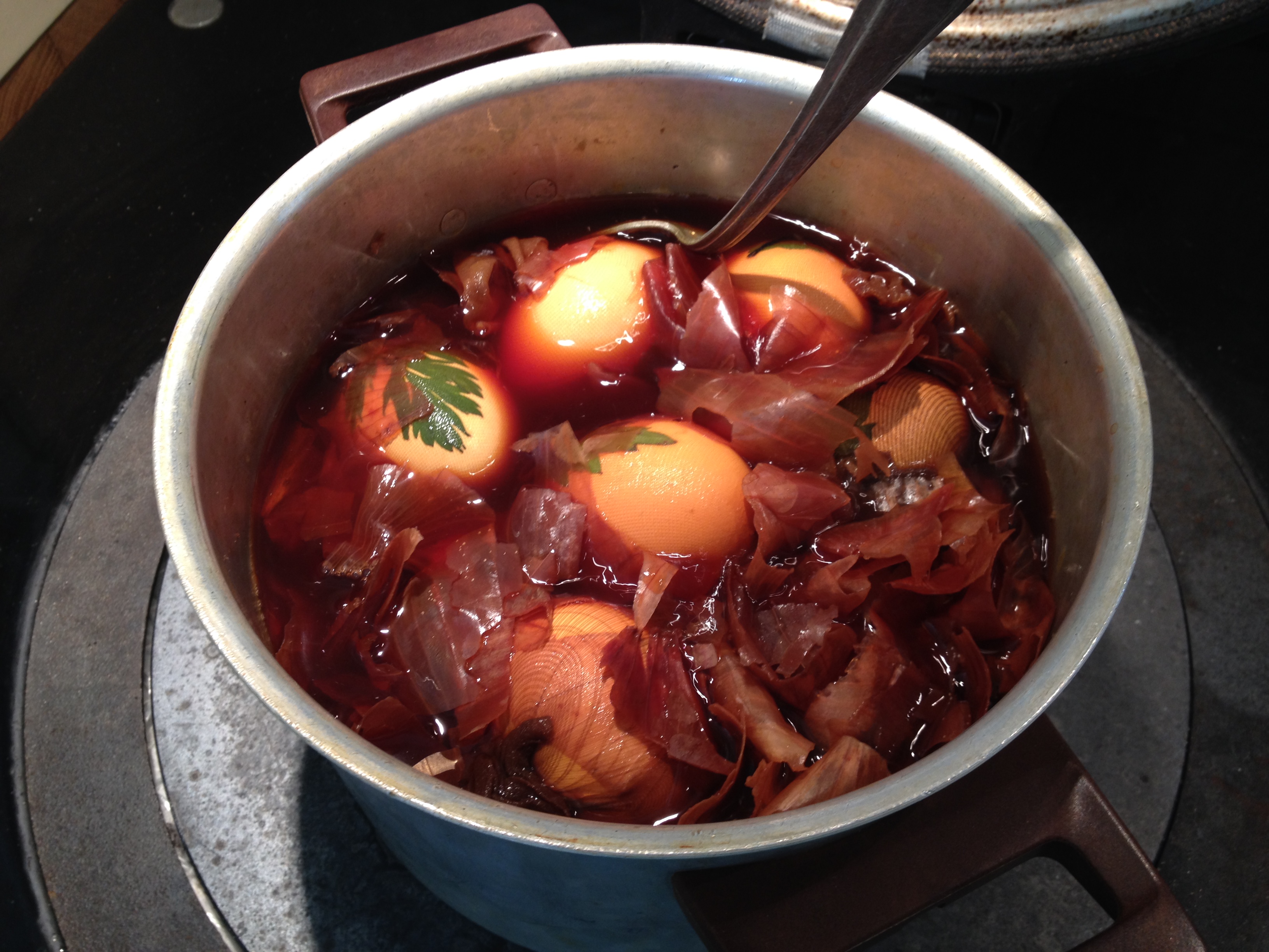 Bruker å farge ca 30 egg, og koker 5-6 ganger i samme vannet med løkskall.